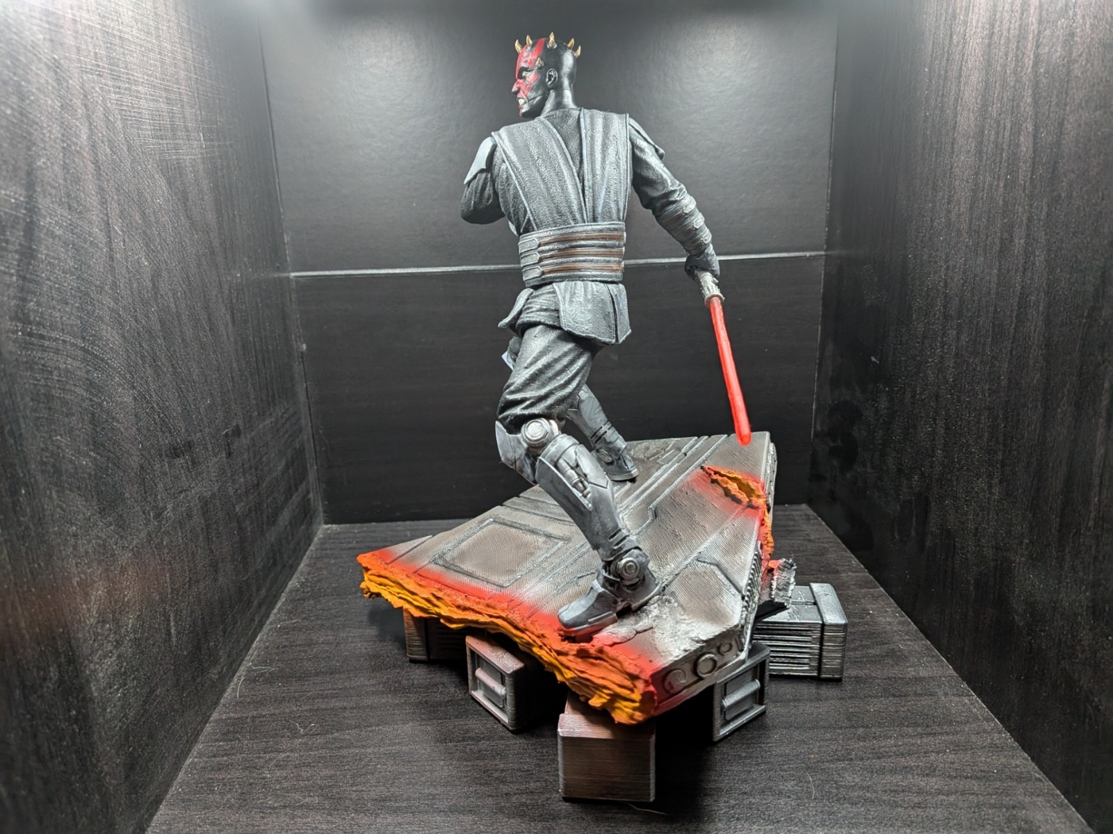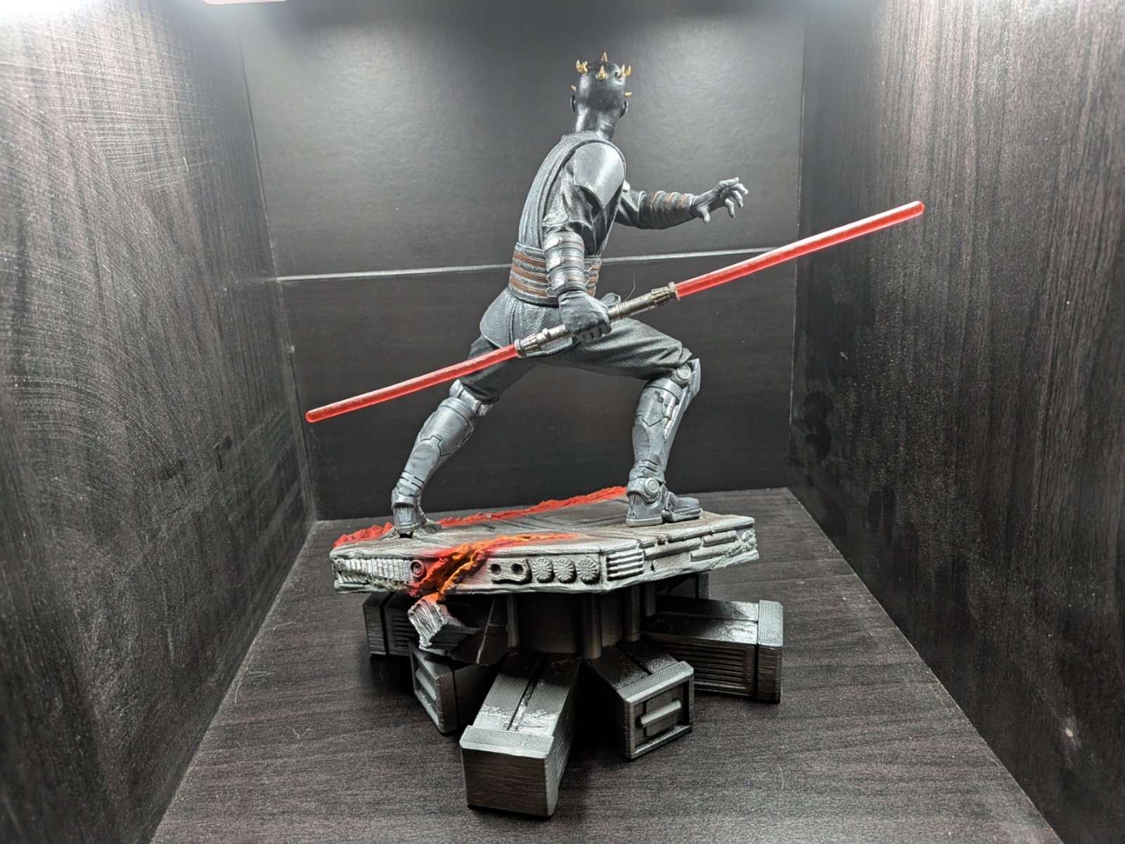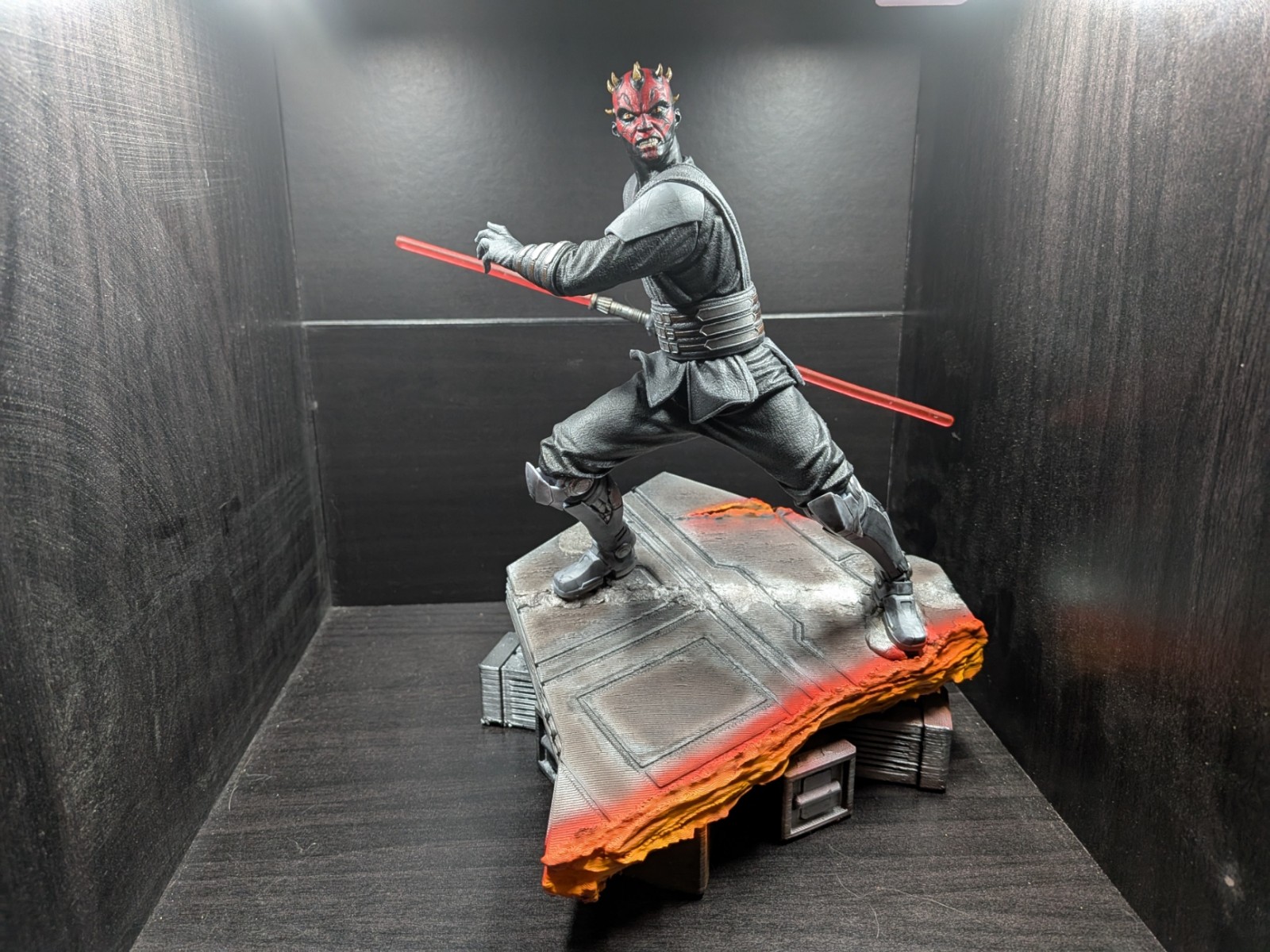 Printed with Resin and a FDM printed base, this Darth Maul figure was completed on 7/29/2025. The red lightsaber was printed with translucent Red Resin. Maul was painted by hand, while the base was painted by an airbrush.